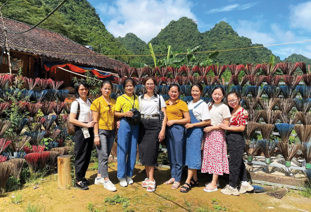 Du khách tham quan, trải nghiệm tại làng nghề làm hương Phja Thắp, xã Quảng Uyên.