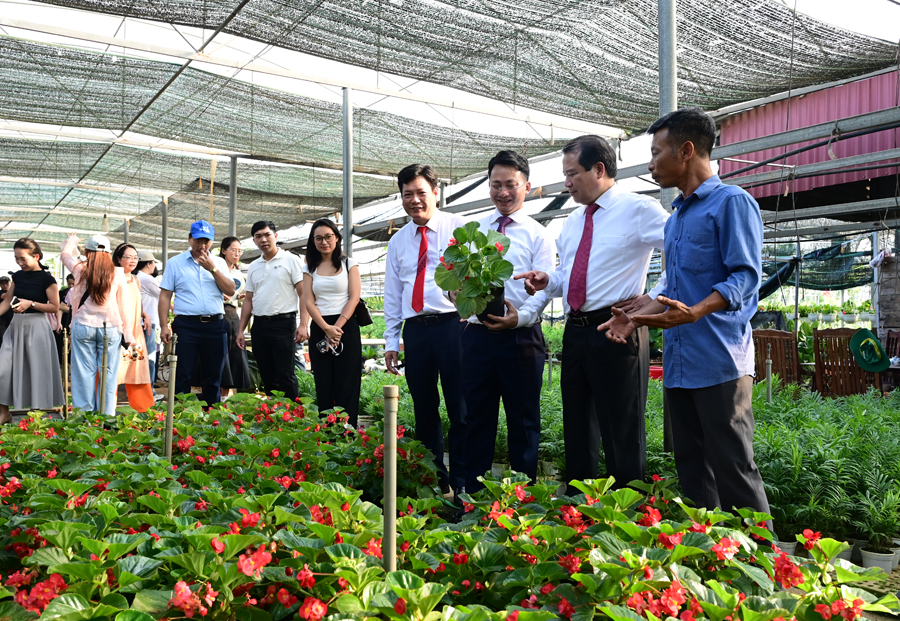 Các đại biểu khảo sát nhà vườn trồng hoa xã Phúc Thọ. Ảnh: TITC