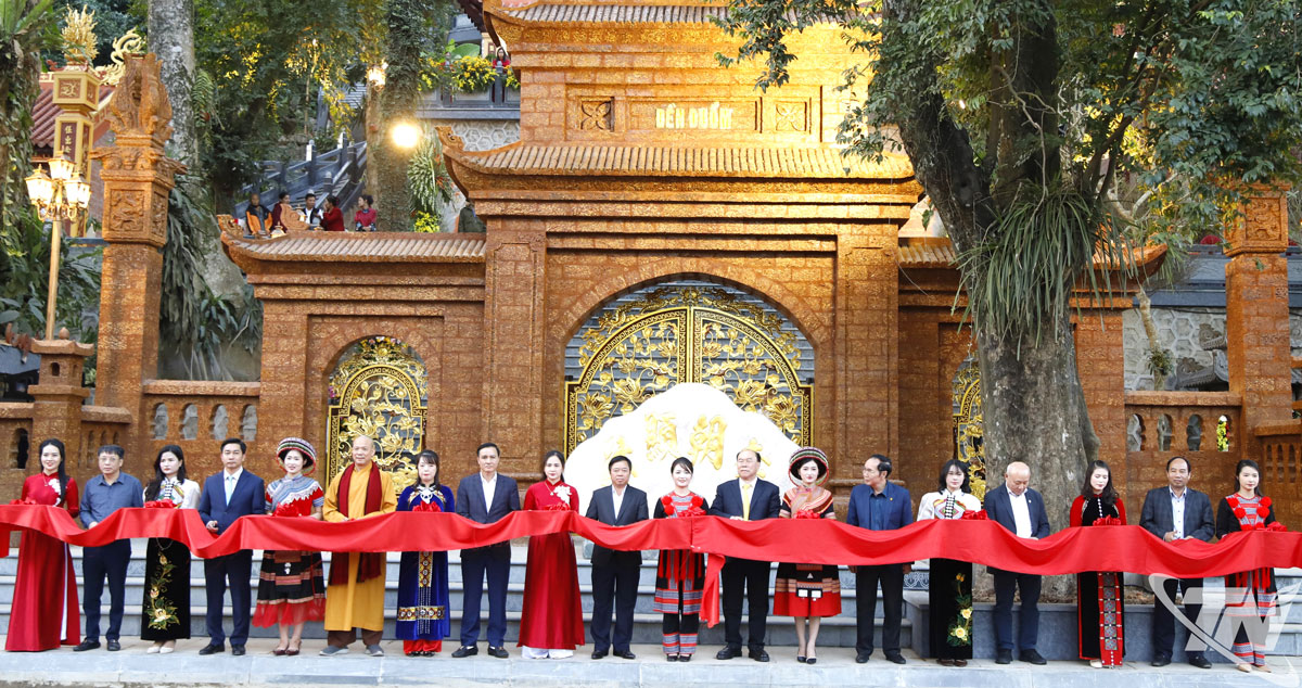 Các đại biểu cắt băng khánh thành công trình tu bổ, tôn tạo Di tích lịch sử thắng cảnh đền Đuổm (tháng 11/2025). Ảnh: T.L