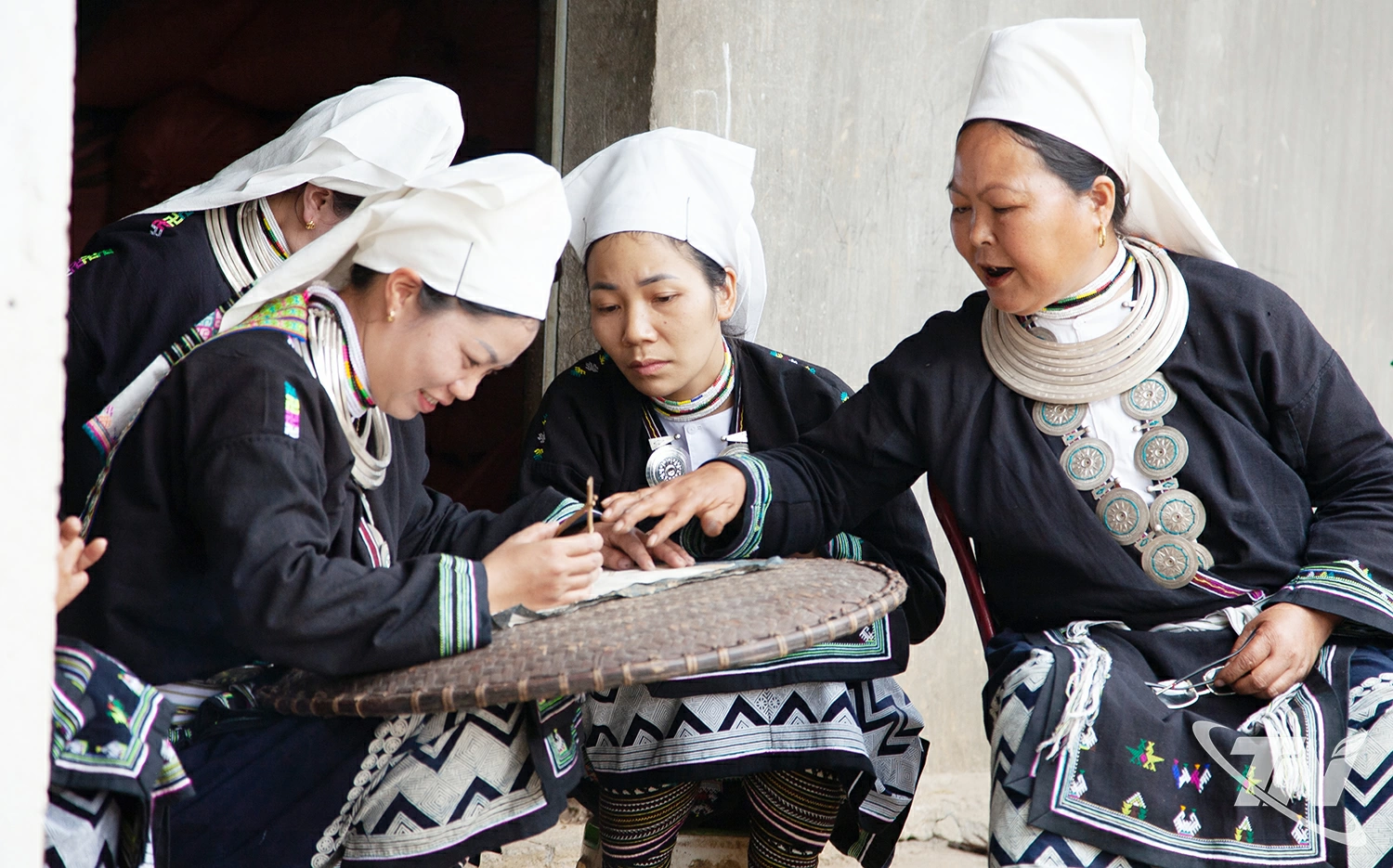 Nghệ nhân Đặng Thị Xuyên (ngoài cùng bên phải), ở thôn Tân Ý 2, xã Ngân Sơn truyền dạy nghệ thuật in sáp ong trên trang phục của người Dao Tiền.