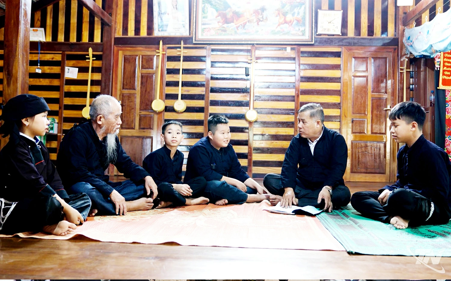 Nghệ nhân ưu tú Nông Văn Hồ (thứ hai từ phải sang) truyền dạy hát sli cho thế hệ trẻ tại xã Xuân Dương.