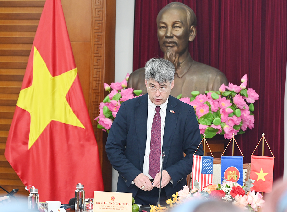 Ngài Brian McFeeters, Đại sứ, Chủ tịch kiêm Tổng Giám đốc Hội đồng Kinh doanh Hoa Kỳ - ASEAN (US-ABC) phát biểu tại buổi làm việc (Ảnh: TITC)