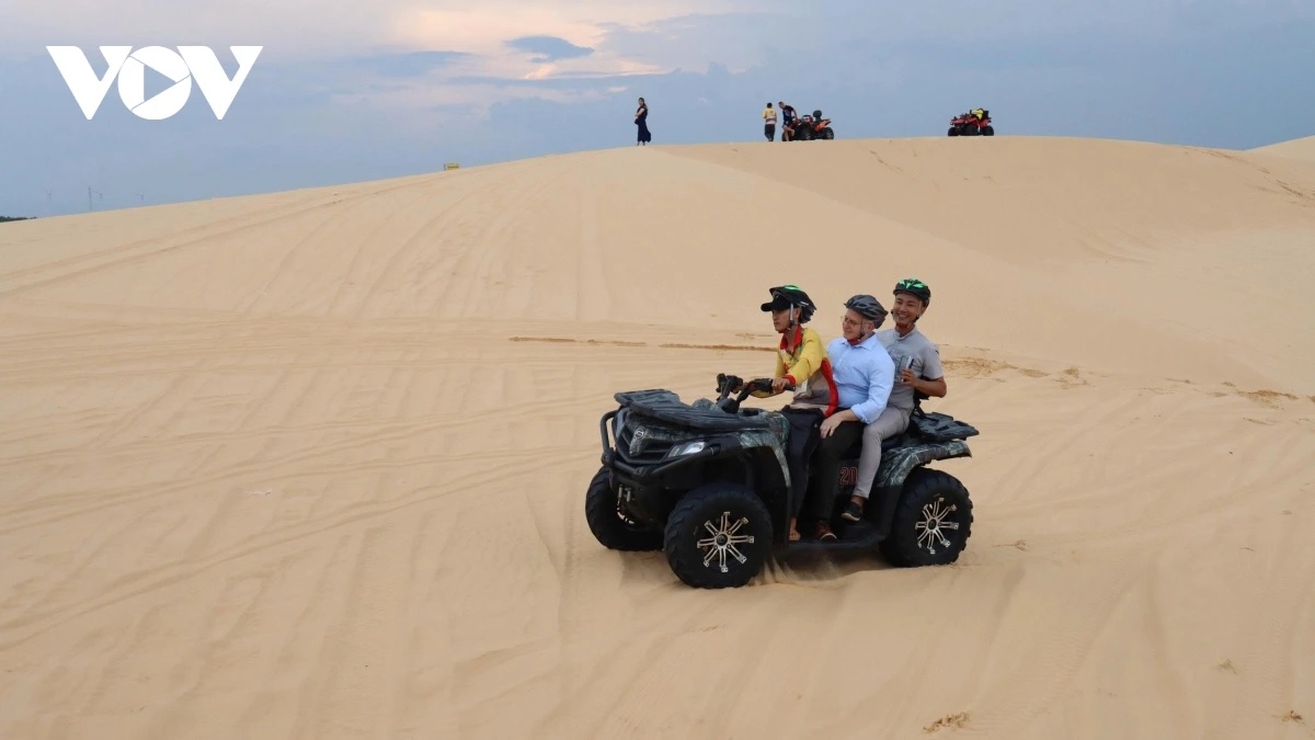 Du khách thích thú trải nghiệm xe địa hình vượt đồi cát trắng tại khu du lịch Bàu Trắng U&ME - điểm đến đang “thay da đổi thịt” sau khi hình thành tỉnh Lâm Đồng mới