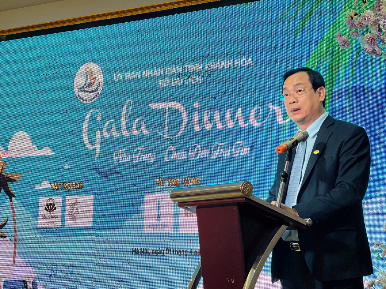 Chủ tịch Hiệp hội du lịch tỉnh Khánh Hòa giới thiệu các sản phẩm mới, gói ưu đãi về lưu trú, vui chơi giải trí, lữ hành và sự kiện lớn của du lịch Khánh Hòa. Ảnh TITC