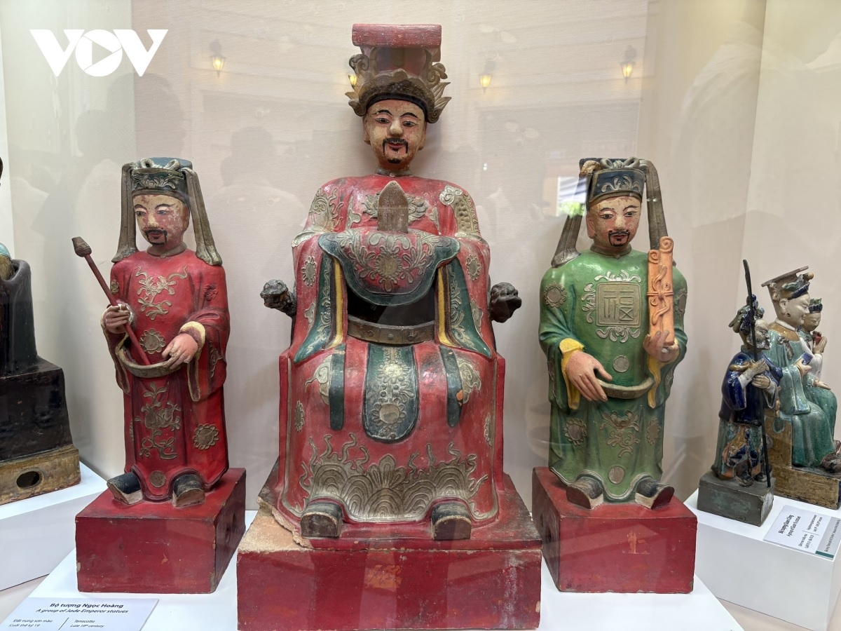 50 hiện vật tiêu biểu được trưng bày, chia thành 4 nhóm chủ đề gồm: tượng thờ Phật giáo như Phật, Bồ Tát, La Hán, Diêm Vương, với tư thế và trang phục tuần thủ nghiêm ngặt quy tắc đồ tượng học Phật giáo; tượng thờ đạo giáo tiêu biểu là bộ Tam Quan Đại Đế; tượng thờ dân gian gồm các pho tượng đặc sắc như Ngọc Hoàng, Phúc Đức Thổ Địa, Quan Thánh Đế Quân, Chúa Tiên Nương Nương... mang dậm phong cách tạo hình dân gian; tượng trang trí kiến trúc bao gồm tượng các nhân vật Đạo giáo và dân gian như Bát Tiên, Ông Nhật - Bà Nguyệt, …cùng các quần thể tiểu tượng thường được gắn trên mái đình, chùa, miếu, hội quán của cả người Việt lẫn người Hoa.