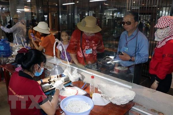 Du khách tham quan khu chế tác các sản phẩm ngọc trai tại một cơ sở trên đảo Phú Quốc. (Ảnh: Lê Huy Hải/TTXVN)