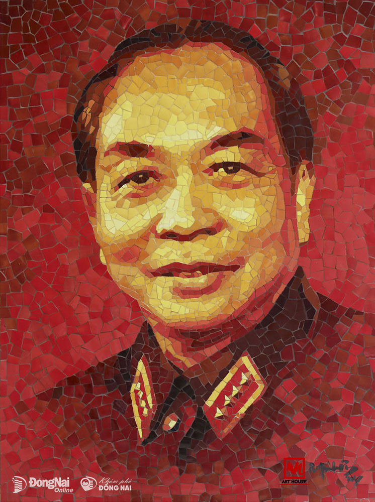 Chân dung Đại tướng Võ Nguyên Giáp được thể hiện bằng tranh ghép gốm Biên Hòa. Tác phẩm được phóng tác từ một bức ảnh nổi tiếng, thể hiện gương mặt đôn hậu, truyền tải ý chí kiên cường trong phong thái điềm đạm, bao dung của một vị tướng vì dân.