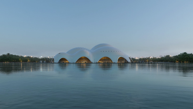 Classic FM mô tả công trình được thiết kế bởi Renzo Piano Building Workshop phối hợp cùng PTW Architects, nằm nổi trên mặt hồ Đầm Trị như một hòn đảo.
