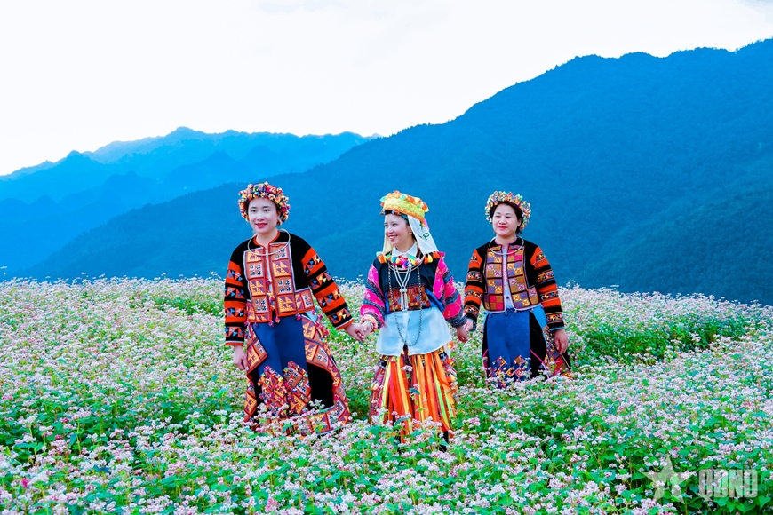 Sắc hoa Tam giác mạch hòa cùng trang phục truyền thống phụ nữ vùng cao, tạo nên bức tranh văn hóa giữa cao nguyên đá Tuyên Quang.
