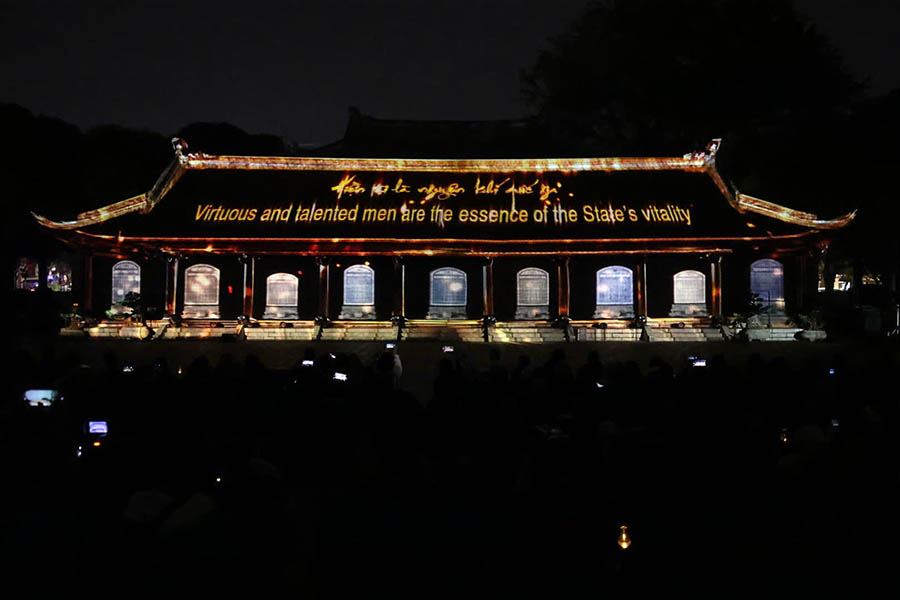 Buổi trình chiếu 3D mapping nghệ thuật dẫn dắt người xem vào thế giới huyền bí của những tấm bia đá, nơi từng kỳ thi bảng vàng vang danh và từng tấm bia Tiến sĩ trở thành những biểu tượng sống động của trí tuệ Việt. Không chỉ là đá, những tấm bia ấy còn là pho sử ngàn đời, lưu giữ niềm tự hào về truyền thống tôn vinh hiền tài.