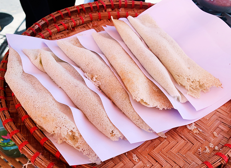Khi bột đã chuẩn bị xong thì bắc chảo lên bếp, không cần cho dầu. Đợi khi chảo đủ độ nóng sẽ dùng một cái rây mắt nhỏ, rây bột thật đều lên mặt chảo thành hình tròn. Bột sẽ tự kết dính lại thành bánh. Khi đó để thêm nhân vào giữa rồi gập bánh lại thành hình bán nguyệt, tiếp tục trở đều đến khi bánh chín.