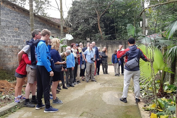 Du khách quốc tế nghe giới thiệu về cây cọ và nguyên liệu làm nón lá tại làng nón Gia Thanh