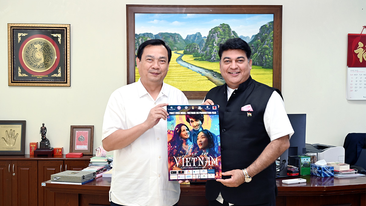 Cục trưởng Cục Du lịch Quốc gia Việt Nam Nguyễn Trùng Khánh và Nhà sản xuất phim Rahul Bali chụp ảnh lưu niệm cùng poster phim "Love in Vietnam". Ảnh: TITC